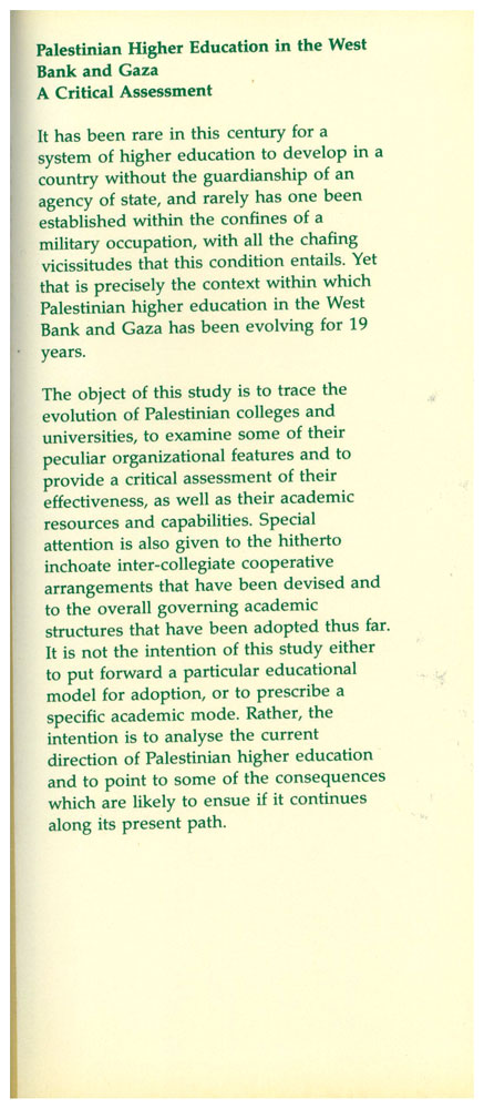 Palestinian Higher Education in the West Bank and Gaza A Critical Assessment |