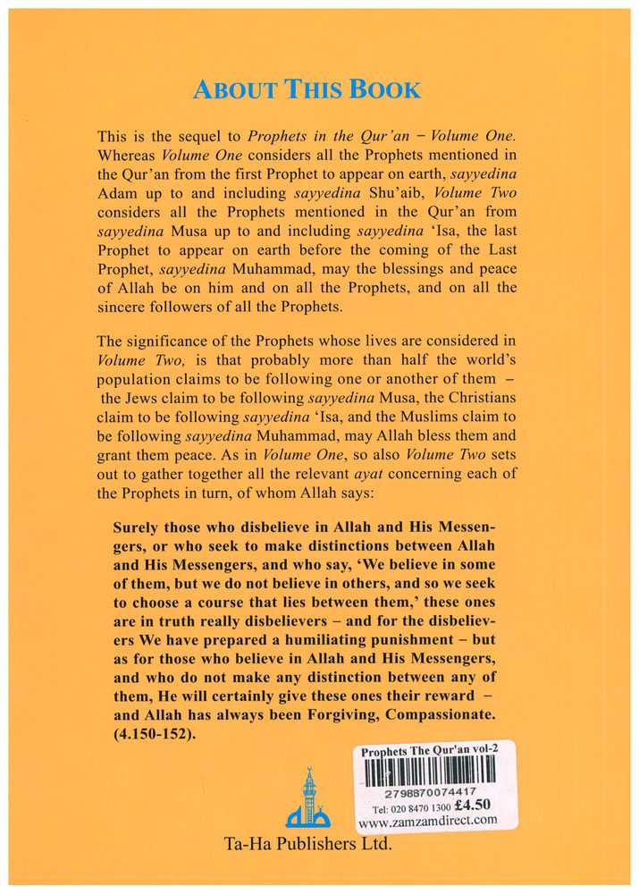 This is the sequel to Prophets in the Qur’an - Volume One. Whereas Volume One considers all the Prophet mentioned in the Qur’an from the first prophet to appear on earth, sayyedina Adam up to and including sayyedina Shu’aib, Volume two considers all the prophets mentioned in the Qur’an from sayyedina Musa up to and including sayyedina Isa, the last prophet to appear on earth before the coming of the last prophet, sayyedina Muhammad, may the blessings and the peace of Allah be on him and on all the prophets, and so all the sincere followers of all prophets. The significance of the prophet whose lives are considered in Volume two, is that probably more than half the world’s populations claims to be following sayyedina Musa, the Christians claim to be following sayyedina Isa, and the Muslims claim to be following sayyedina Muhammad, may Allah bless them and grant them peace. As in Volume One, so also Volume Two sets out to gather together all the relevant ayat concerning each of the prophets in turn, of whom Allah says: Surely those who disbelieve in Allah and His Messengers, who seek to make distinctions between Allah and His Messengers, and who says, ‘We believe in some of them, but we do not believe in others, and so we seek to choose a course that lies between them, ‘these ones are in truth really disbelievers-and for the disbelievers we have prepared a humiliating punishments - but as for those who believe in Allah and His Messengers, and who do not make any distinctions between any of them, He will certainly give these ones their reward- and Allah has always been Forgiving, Compassionate.
