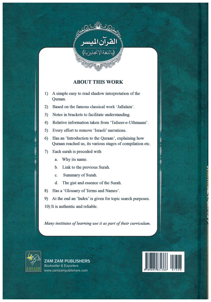 Also contains an Introduction to the Quran, revelation, authority of the Quran, compilation of the Quran, etiquettes of reading and reciting the Quran, a glossary of terms and names and the science of Tafsir.