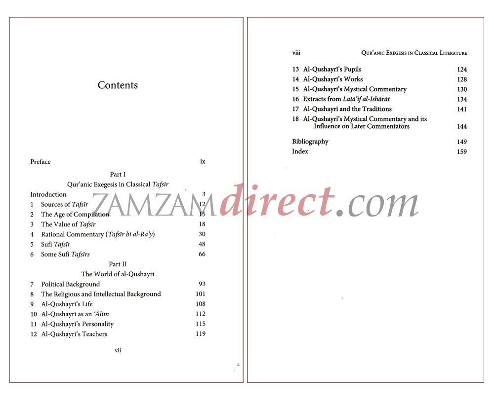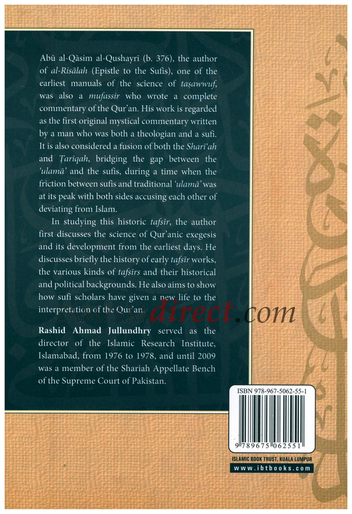 This work gives a particular reference to Abu al-Qasim al-Qushayri, the author of the Sufi work, Al-Risalah, who wrote a complete commentary of the Qur'an, which is regarded as the first 'mystical' commentary, a fusion of Shariah and Tariqah that bridged the sometimes fictitious ties between sufis and ulama. The author studies the history of this tafsir, the science of Qur'anic tafsir and its development, aiming to show how Sufi scholars too have given a new life to the interpretation of the Qur'an.