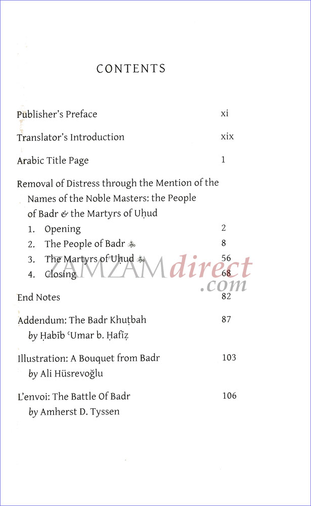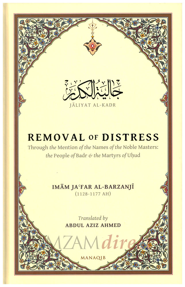 “Removal of Distress through the Mention of the Names of the Noble Masters: the People of Badr and the Martyrs of Uhud” is the first English translation of a unique supplicatory poem known in Arabic as Jaliyat al-Kadr bi dhikr asma’ Ahl al-Badr wa Shuhada’ Uhud al-Sadat al-Ghurar. In it, Allah most High is beseeched for deliverance through the Prophet and his erstwhile companions who fought alongside him in the battles of Badr and Uhud.