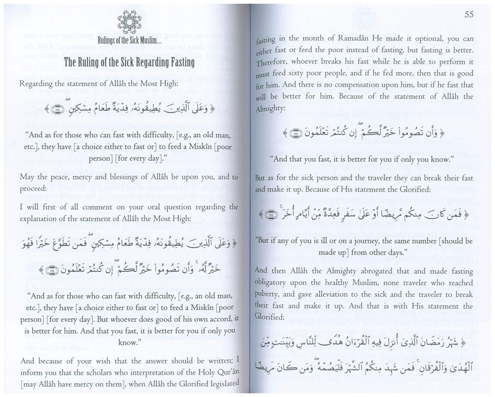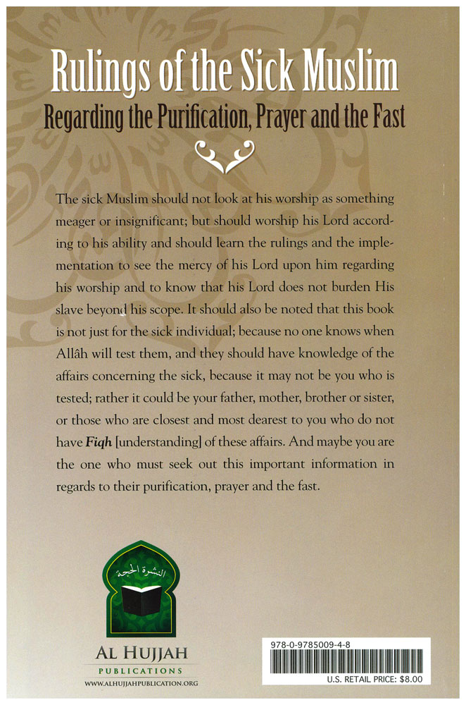It should also be noted that this book is not just for the sick individual; because no one knows when Allâh will test them, and they should have knowledge of the affairs concerning the sick, because it may not be you who is tested; rather it could be your father, mother, brother or sister, or those who are closest and most dearest to you who do not have Fiqh [understanding] of these affairs. And maybe you are the one who must seek out this important information in regards to their purification, prayer and the fast.