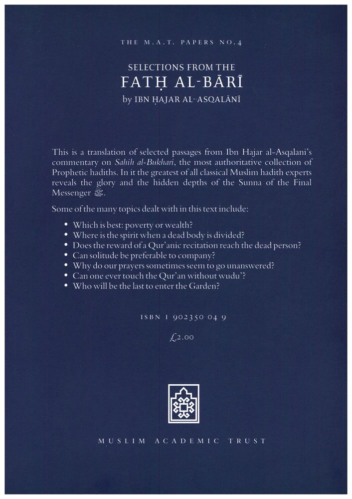 Author: Ibn Hajar Al-Asqalani Translator: Abdal Hakim Murad Publisher: Muslim Academic Trust Size/Vol.: A5 (14.8x21 cm - 5.83x8.27 in) ISBN : 1902350049 Language : English -Binding: Paperback -