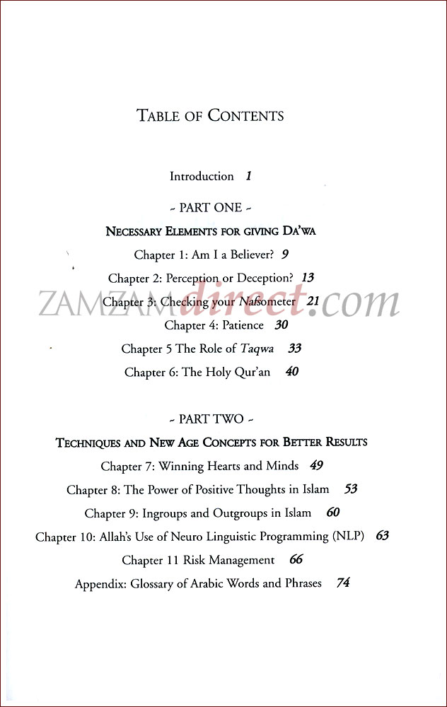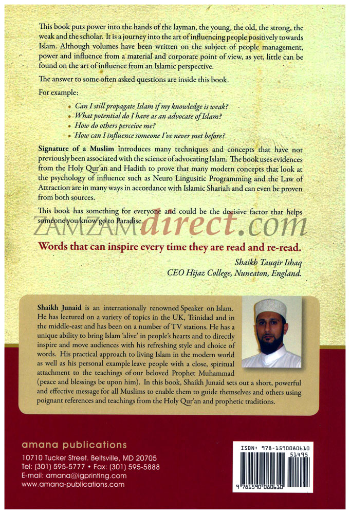 Signature of a Muslim introduces many techniques and concepts that have not previously been associated with the science of advocating Islam. The book uses evidences from the Holy Quran and Hadith to prove that many modern concepts that look at the psychology of influence such as Neuro Linguistic Programming and the Law of Attraction are in many ways in accordance with Islamic Shariah and can even be proven from both sources.