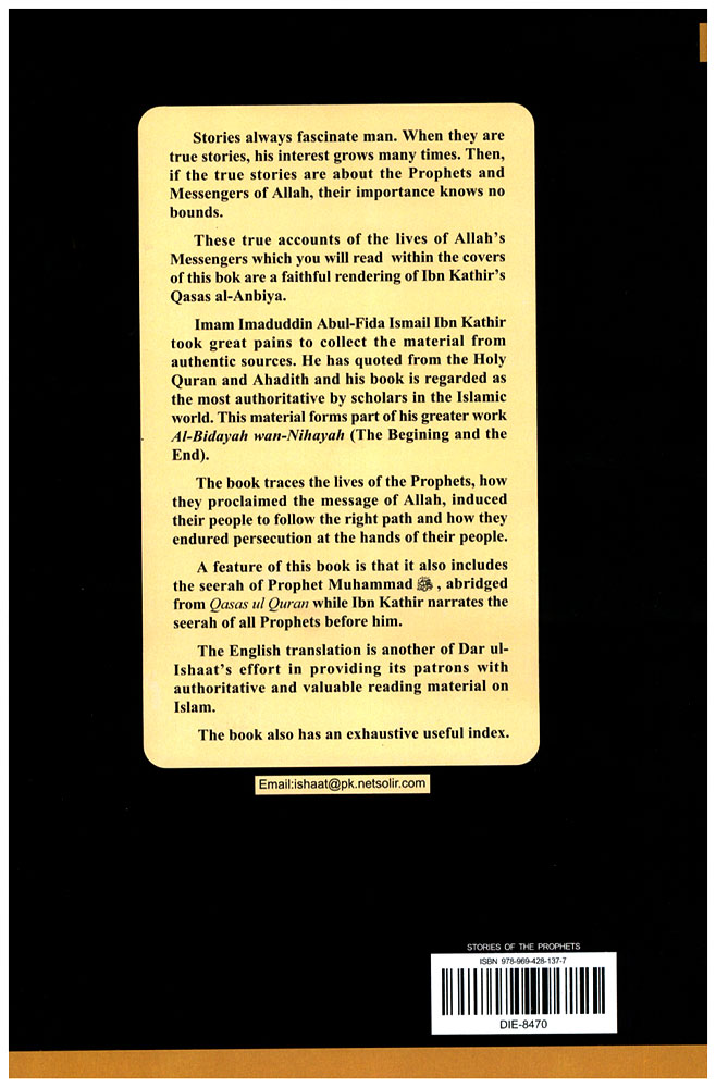 This translation is different from many of the other available translations of Ibn Kathir's Stories of the Prophets because the Stories of the Prophets not mentioned in the Qur'an but only mentioned in Hadith (Sayings of the Prophet (SAW) have also been translated.