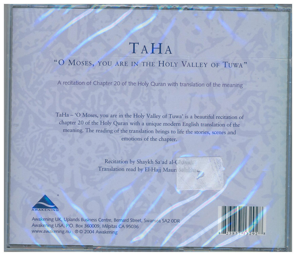 -A Recitation of chapter 20 (Ta-Ha) of the Holy Qur’an with Translation of the Meaning. A sweet recitation in Arabic by Shaykh Sa'ad al-Ghamdi of Chapter 20 followed by English translation of the meaning read by El-Hajj Mauri Saalakhan. The Arabic recitation and the translation alternate chapter by chapter.