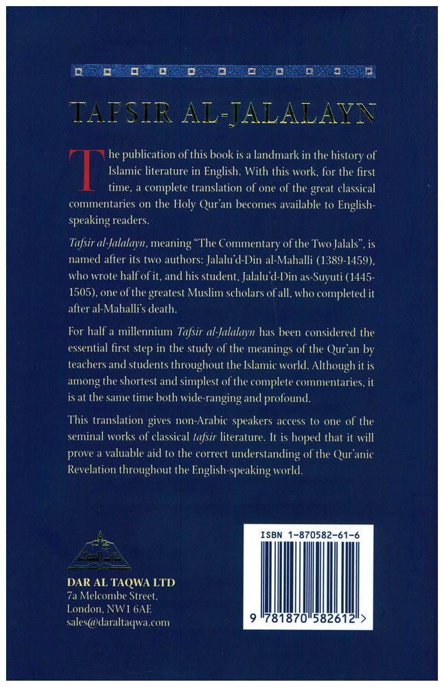 The publication of this book is a landmark in the history of Islamic literature in English. With this work, for the first time, a complete translation of one of the great classical commentaries on the Holy Qur’an becomes available to English-speaking readers. Tafsir al-Jalalayn, meaning 'The Commentary of the Two Jalals' is named after its two authors: Jalalu’d-Din al-Mahalli (1389-1459), who wrote half of it, and his student, Jalalu’d-Din as-Su~uti (1445-1505), one of the greatest Muslim scholars of all, who completed it after al-Mahalli’s death. For half a millennium Tafsir al-Jalalayn has been considered the essential first step in the study of the meanings of the Qur’an by teachers and students throughout the Islamic world Although it is among the shortest and simplest .of the ‘complete commentaries, it is at the same time both wide-ranging and profound This translation gives non-Arabic speakers access to one of the seminal works of classical tafsir literature. It is hoped that it will prove a valuable aid to the correct understanding of the Qur’anic Revelation throughout the English-speaking world.
