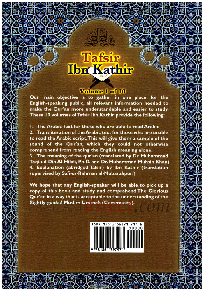 This will give them a sample of the sound of the Qur'an, which they could not otherwise comprehend from reading the English meaning. 3. The meaning of the qur'an (translated by Dr. Muhammad Taqi-ud-Din Al-Hilali, Ph.D. and Dr. Muhammad Muhsin Khan) 4. Background introductions by two famous Islamic scholars, Maududi and Ibn Kathir 5. Explanation (abridged Tafsir) by Ibn Kathir (translated by Safi-ur-Rahman al-Mubarakpuri) We hope that by doing this an ordinary English-speaker will be able to pick up a copy of this book and study and comprehend The Glorious Qur'an in a way that is acceptable to the understanding of the Rightly-guided Muslim Ummah (Community).