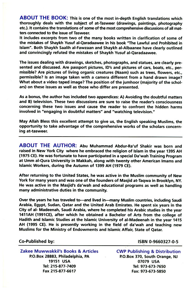 Both Shaykh Saalih al-Fawzaan and Shaykh al-Albaanee have clearly outlined and convincingly refuted the mistakes of Shaykh Qaradawi. The issues dealing with drawings, sketches, photographs, and statues, are clearly presented and discussed. Are passport pictures, ID’s and pictures of cars, boats, etc., permissible? Are pictures of living organic creatures (Naam) such as trees, flowers, etc., permissible? Is an image taken with a camera different from a hand drawn image? What about a video taped image? The position of the Jumhoor (majority of the scholars) on these issues as well as those who differ are presented.
