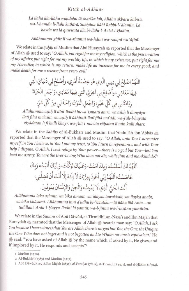 Kitab al-Adhkar is the definitive compilation of words of remembrance and glorification of (dhikr), and supplicatory prayer to (du'a), the Lord of the Universe, as related from His final Emissary, the Prophet Muhammad (may Allah bless and exalt him).