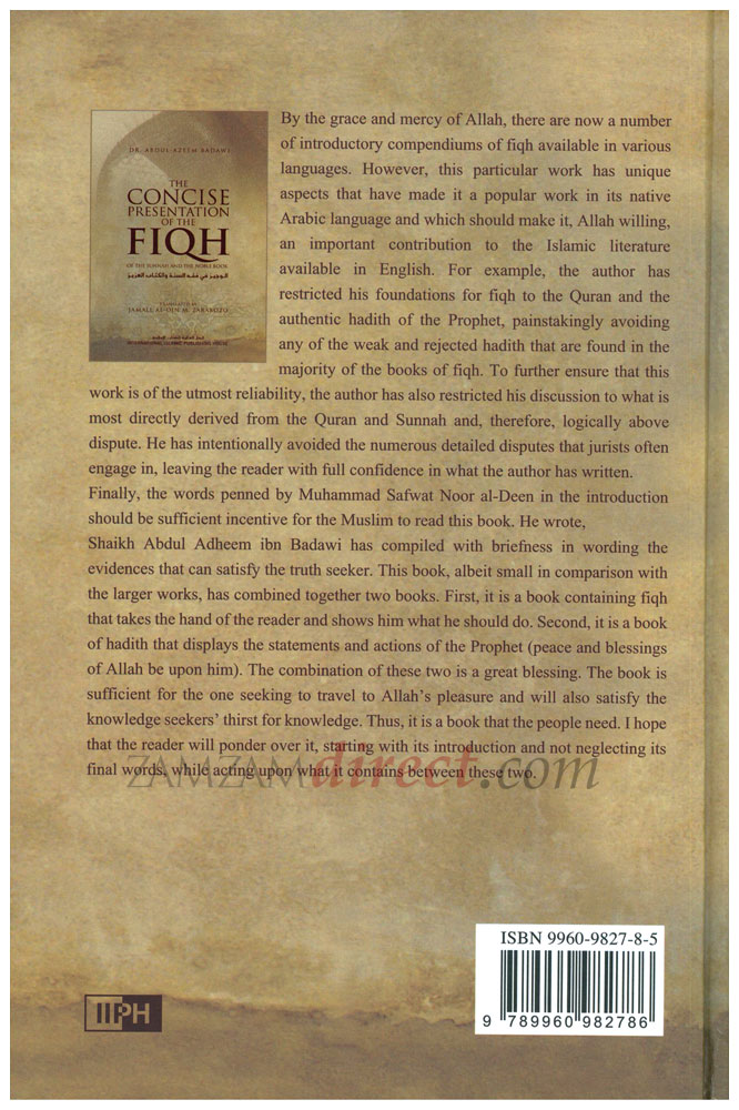 Finally, the words penned by Muhammad Salwat Noor al-Deen in the introduction should be sufficient incentive for the Muslim to read this book. He wrote, Shaikh Abdul Adheem ibn Badawi has complied with briefness in wording the evidences that can satisfy the truth seeker. This book, albeit small in comparison with the larger works, has combined together two books. First, it is a book containing fiqh that takes the hand of the reader and shows him what he should do. Second it is a book of hadith that displays the statements and actions of the Prophet (peace and blessings of Allah be upon him). The combination of these two is a great blessing.