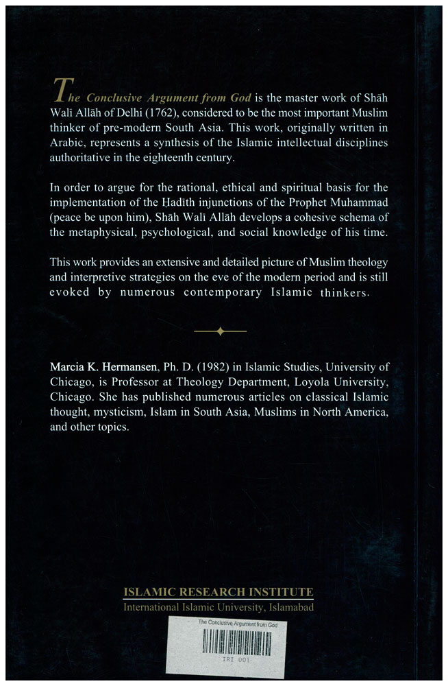 The Conclusive Argument of God is the master work of Shah Wali Allah of Delhi (1762), considered to be the most important Muslim thinker of pre-modern South Asia. This work, originally written in Arabic, represents a synthesis of the Islamic intellectual disciplines authoritative in the 18th century.