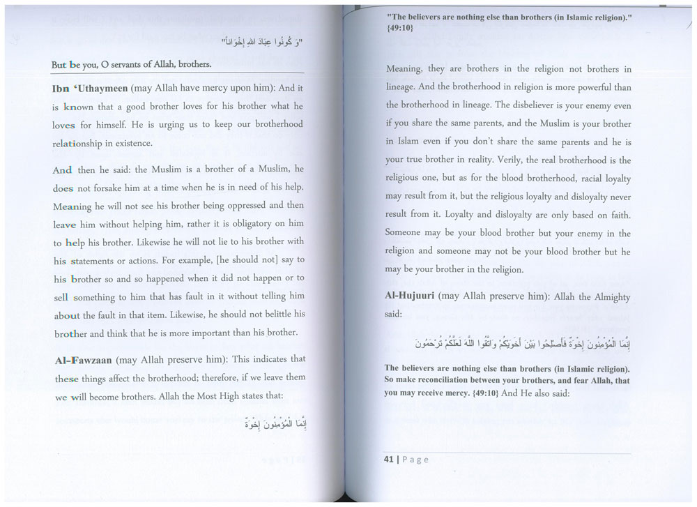 " Akhee a Muslim is a brother of another Muslim, a sister is a Muslim sister to another sister. Don't you see that you come bowing along with those who bow. Don't think that my talking isn't sincere in absence of love, know, by Allah, by Allah! I love the brothers for the pleasure of Allah, I love them because they recognize the Oneness of Allah, I love them because they perform wudhu (ablution) in the darkness of night in the middle of the morning; I love them because they raise their hands and say Allahu Akbar (Allah is greater than everything) and face the qiblah (i.e. the East towards the Ka'bah in Makkah), and start to discourse with their Lord, I love them because they perform ruku' (bowing), and sujood (prostration), and they glorify their Lord; I love them because they grow their beards and wear their thowbs above their ankles, I love them for the pleasure of Allah...