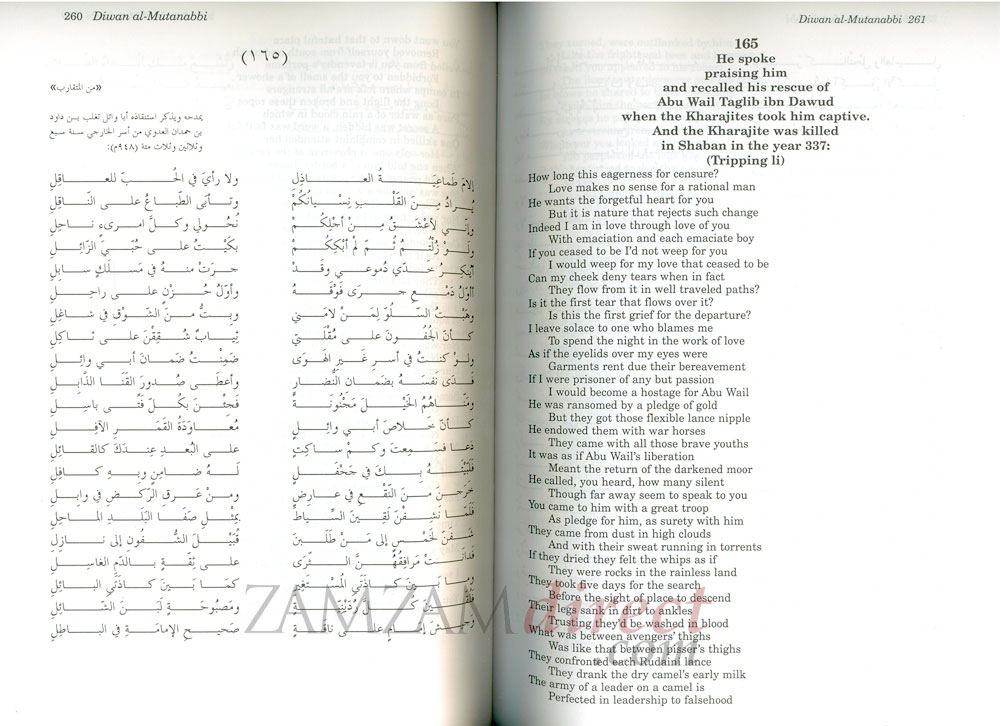 Born in Kuf in southern Iraq in 915 AH, his poetic abilities were fostered from an early age. He spent some of his boyhood with the Bedouin in the desert who were thought to speak a purer form of Arabic than the people of the cities. The Bedouin also cultivated the verse forms which had been developed in the centuries during which Islam spread beyond the confines of Arabia. This diwan is one of the chief literary works that make up the literary tradition of the Arabic language and the writings of Shakespeare, Cervantes, Goethe and Victor Hugo have been compared to Mutanabbi.