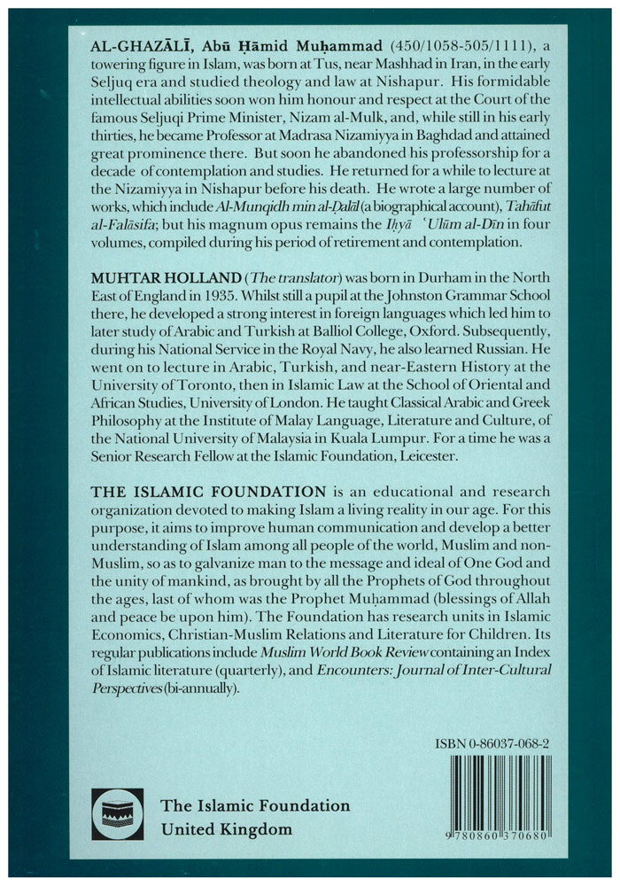 Author: Imam al-Ghazali Translator: Muhtar Holand Publisher: The Islamic Foundation Size/Vol.: A5 (14.8x21 cm - 5.83x8.27 in) ISBN : 0860370682 Language : English -Binding: Paperback -