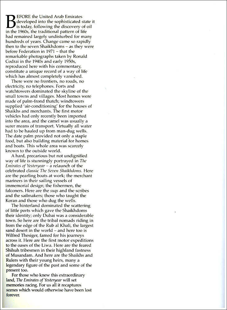 The Emirates of Yesteryear, the re-launch of the celebrated book The Seven Shaikhdoms, is a classic account of a nation's birth. It forms a unique photographic record of Dubai, Abu Dhabi, Sharjah, Umm al Quwain, Fujairah, Ras al Khaima and Ajman before they formed the sophisticated Arab Emirates we know today. The photographs, taken by Ronald Codrai in the 1940s and 50s, depict a way of life which has almost completely vanished.