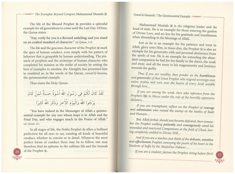 A result of a some diligent work, rather than presenting the life of Prophet Muhammad blessings and peace be upon him, the book instead brings to the fore his exemplary character; and searching for an answer to the question of how a perfect Muslim ought to be, seeks to present the characteristics of an ideal Muslim. In the words of the Quran, he is the uswat ul-hasanah, the quintessential example. His sublime morals reflect onto the beauty of his spirit and appearance. His deeds of worship, manners, propriety, courage and compassion all mirror his characteristic of being the quintessential example; so too his social relations and his conduct towards orphans, the elderly, women and the underprivileged. Offering the magnificent character of Prophet Muhammad blessings and peace be upon him- in a bouquet, the exceptional work by Osman Nuri Topbaş is set to tie afresh our bond to the Prophet blessings and peace be upon him.