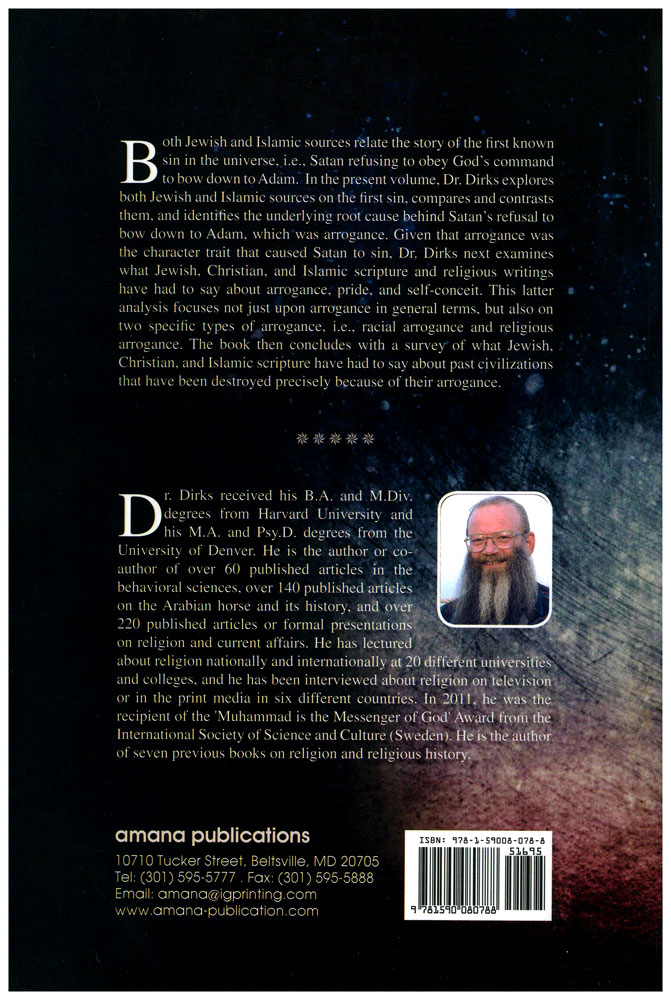 Both Jewish and Islamic sources relate the story of the first known sin in the universe, i.e., Satan refusing to obey God’s command to bow down to Adam. In the present volume, Dr. Dirks explores both Jewish and Islamic sources on the first sin, compares and contrasts them, and identifies the underlying root cause behind Satan’s refusal to bow down to Adam, which was arrogance. Given that arrogance was the character trait that caused Satan to sin, Dr. Dirks next examines what Jewish, Christian, and Islamic scripture and religious writings have had to say about arrogance, pride, and self-conceit. This latter analysis focuses not just upon arrogance in general terms, but also on two specific types of arrogance, i.e., racial arrogance and religious arrogance. The book then concludes with a survey of what Jewish, Christian, and Islamic scripture have had to say about past civilizations that have been destroyed precisely because of their arrogance.
