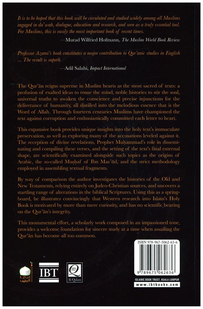 The Quran reigns supreme in Muslim hearts as the most sacred of texts: a profusion of exalted ideas to rouse the mind, noble histories to stir the soul, universal truths to awaken the conscience and precise injunctions for the deliverance of humanity, all distilled into the melodious essence that is the Word of Allah. Through fourteen centuries Muslims have championed the text against corruption and enthusiastically committed each letter to heart. This expansive book provides unique insights into the holy texts immaculate preservation, as well as exploring many of the accusations leveled against it. The reception of divine revelations, Prophet Muhammad's role in disseminating and compiling these verses and the setting of the text's final external shape, are scientifically examined alongside such topics as the origins of Arabic, the so-called Mushaf of Ibn Mas'ud, and the strict methodology employed in assembling textual fragments.