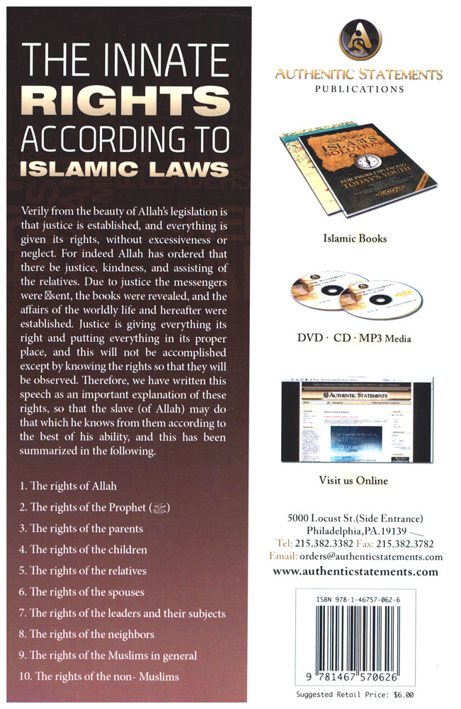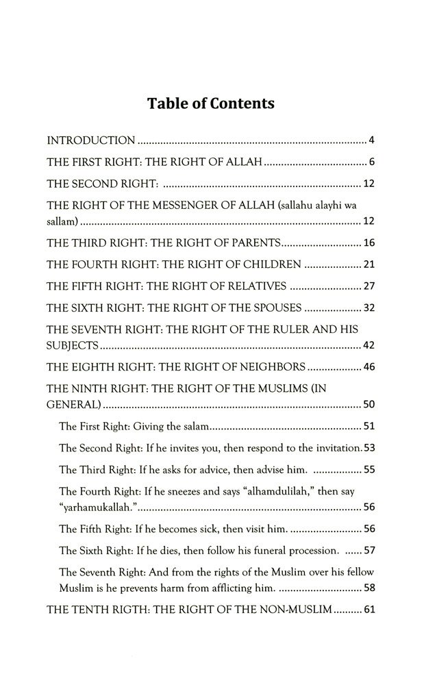 1. The rights of Allah‎ ‎2. The rights of the Prophet (sallahu allahi wasallam)‎ ‎3. The rights of the parents‎ ‎4. The rights of the children‎ ‎5. The rights of the relatives ‎6. The rights of the spouses‎ ‎7. The rights of the leaders and their subjects‎ ‎8. The rights of the neighbours ‎ ‎9. The rights of the Muslims in general‎ ‎10. The rights of the non- Muslims