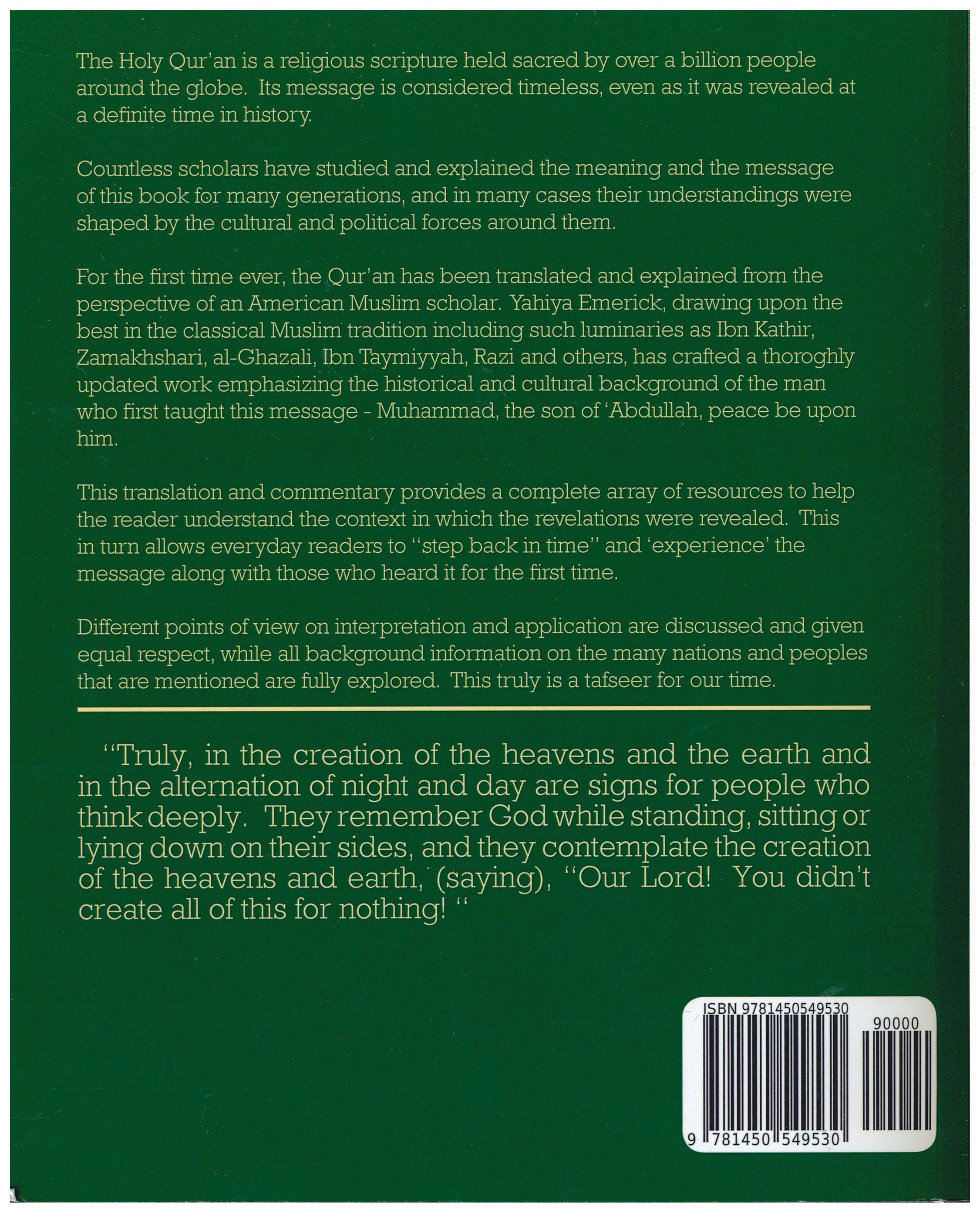 The Holy Qur'an is a religious scripture held sacred by over a billion people around the globe. Its message is considered timeless, even as it was revealed at a definite time in history. Countless scholars have studied and explained the meaning and the message of this book for many generations, and in many cases their understandings were shaped by the cultural and political forces around them. For the first time ever, the Qur'an has been translated and explained from the perspective of an American Muslim scholar. Yahiya Emerick, drawing upon the best in the classical Muslim tradition including such luminaries as Ibn Kathir, Zamakhshari, al-Ghazali, Ibn Taymiyyah, Razi and others, has crafted a thoroughly updated work emphasizing the historical and cultural background of the man who first taught this message - Muhammad, the son of 'Abdullah, peace be upon him. This translation and commentary provides a complete array of resources to help the reader understand the context in which the revelations were revealed. This in turn allows everyday readers to "step back in time" and "experience" the message along with those who heard it for the first time. Different points of view on interpretation and application are discussed and given equal respect, while all background information on the many nations and peoples that are mentioned are fully explored. This truly is a tafseer for our time. "Truly, in the creation of the heavens and the earth and in the alternation of night and day are signs for people who think deeply. They remember God while standing, sitting or lying down on their sides, and they contemplate the creation of the heavens and earth, (saying), "Our Lord! You didn't create all of this for nothing.