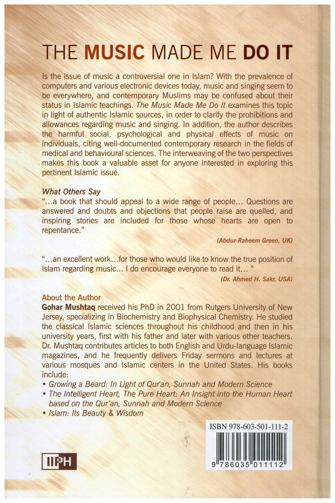 The Music Made Me Do It: An In-Depth Study of Music through Islam and Science examines this topic in light of authentic Islamic sources, in order to clarify the prohibitions and allowances regarding music and singing. In addition, the author describes the social, psychological and physical effects of music on individuals, citing well-documented contemporary research in the fields of medical and behavioural sciences. The interweaving of the two perspectives makes this book a valuable asset for anyone interested in exploring this pertinent Islamic issue.