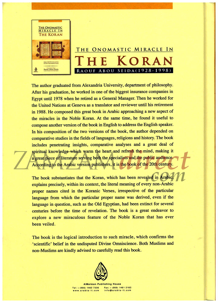 The book substantiates that the Koran, which has been revealed in Arabic, explains precisely, within its context, the literal meaning of every non-Arabic proper names cited in the Koranic verses, irrespective of the particular language from which the particular proper name was derived, even if the language in question, such as the Old Egyptian, had been extinct for several centuries before the time of revelation. The book is a great endeavor to explore a new miraculous feature of the Noble Koran that has ever been veiled.