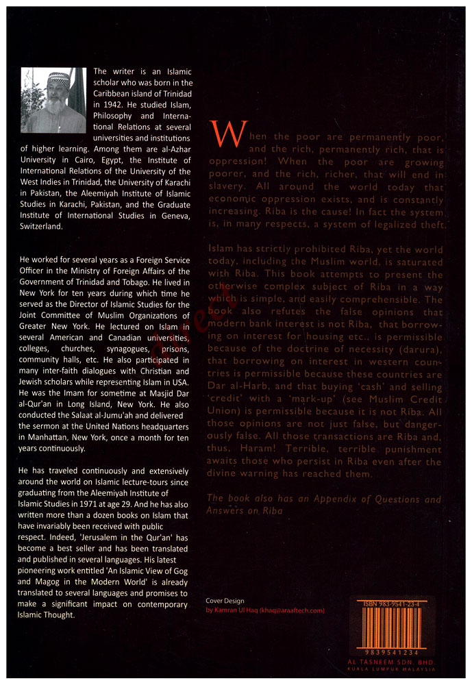 This book attempts to present the otherwise complex subject of Riba in a way which is simple, and easily comprehensible. The book also refutes the false opinions that modern bank interest is not Riba- that borrowing on interest in western countries is permissible because these countries are Dar al-Harb,- and that buying 'cash' and selling 'credit' with a 'mark-up' ( see Muslim Credit Union) is permissible because it is not Riba. The book also has an Appendix of Questions and Answers on Riba.