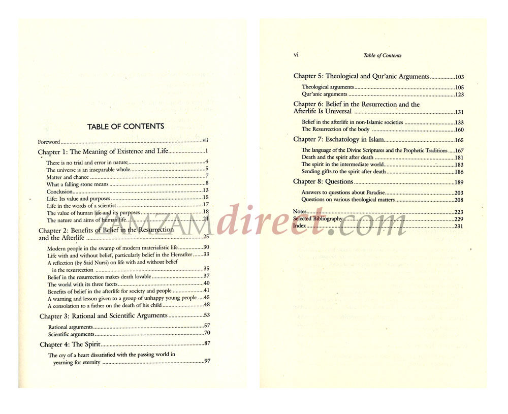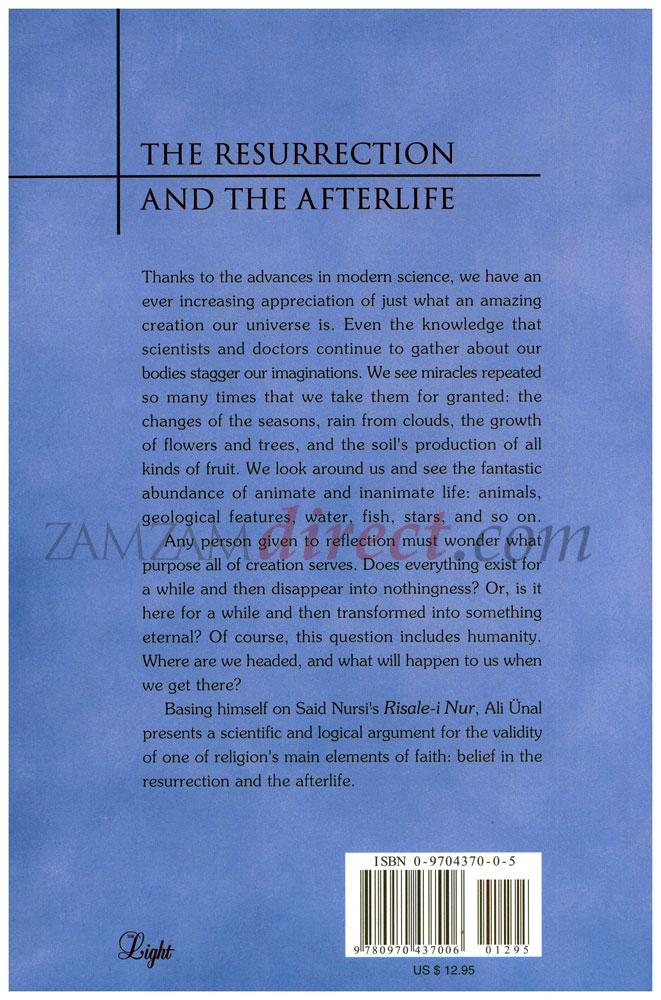 Thanks to the advances of modern science, we have an ever-increasing appreciation of just what an amazing creation our universe is. Even the knowledge that scientists and doctors continue to gather about our bodies stagger our imaginations. We see miracles repeated so many times that we take them for granted; the changes of the seasons, rain from the clouds, the growth of flowers and trees, and the soil's production of all kinds of fruit. We look around us and see the fantastic abundance of animate and inanimate life: animals, geological features, water, fish, stars and so on. Any person given to reflection must wonder what purpose all of creation serves. Does everything exist for a while and then disappear into nothingness? Or, is it here for a while and then transformed into something eternal? Of course, this question includes humanity. Where are we headed, and what will happen to us when we get there? Basing himself on Said Nursi's 'Risale-i Nur', Ali Unal presents a scientific and logical argument for the validity of one of religion's main elements of faith: belief in the resurrection and the afterlife.
