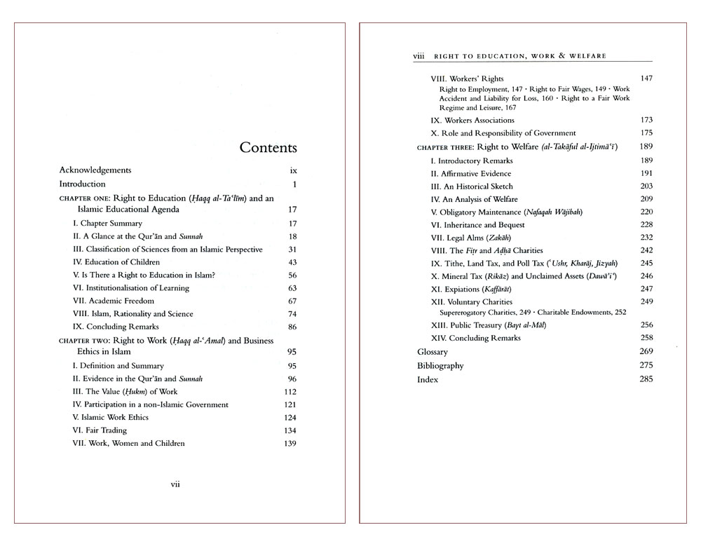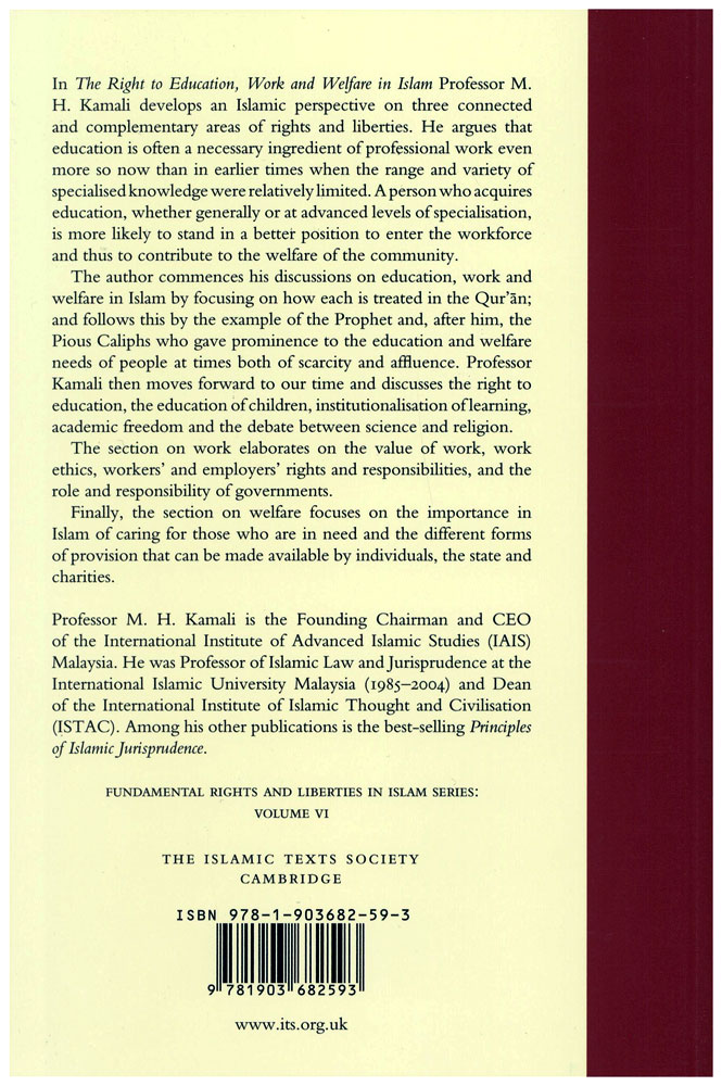 In The Right to Education, Work and Welfare in Islam Professor M.H. Kamali develops an Islamic perspective on three connected and complementary areas of rights and liberties. He argues that education is often a necessary ingredient of professional work even more so now than in earlier times when the range and variety of specialised knowledge were relatively limited. A person who acquires education, whether generally or at advanced levels of specialisation, is more likely to stand in a better position to enter the workforce and thus to contribute to the welfare of the community.