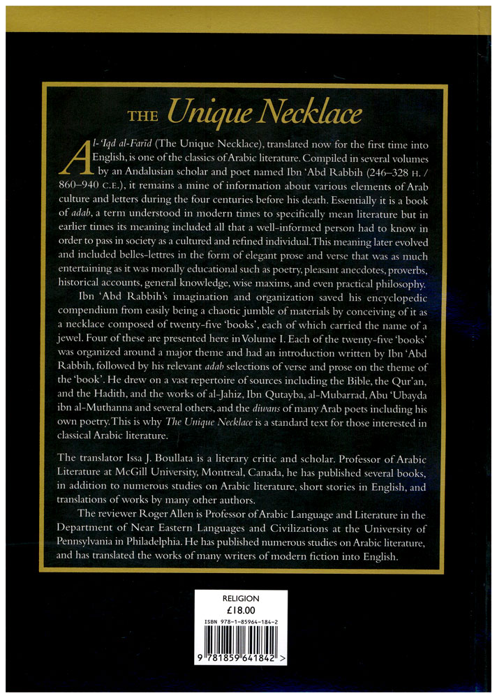 Author: Ibn Abd Rabbih Translator: Issa J. Boullata Publisher: Garnet Publishing Ltd. Size/Vol.: A5_EXTRA (17.3x23.5 cm - 6.81x9.25 in) ISBN : 9781859641842 Language : English -Binding: Paperback -