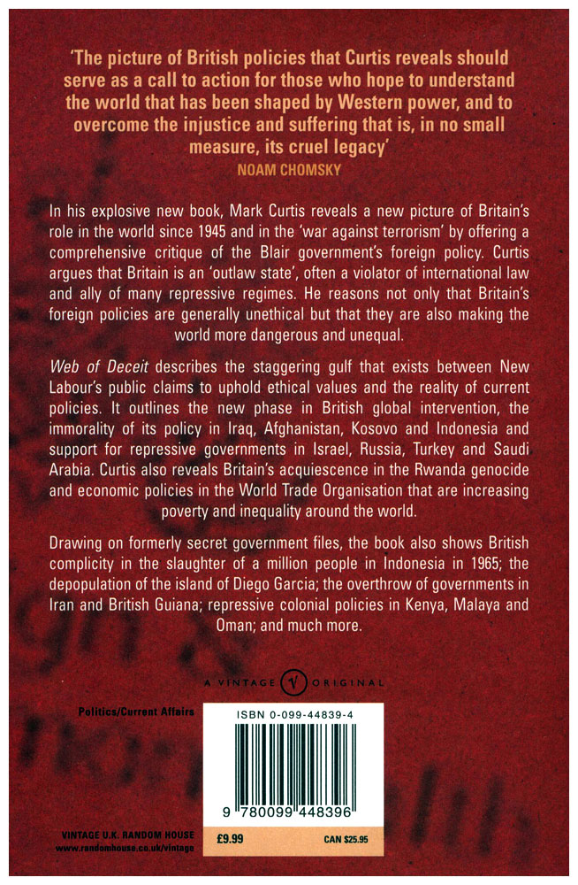 The Web of Deceit describes the staggering gulf that has arisen between New Labour's professed commitment to upholding ethical values and the reality of current policies, including British participation in the 'war on terrorism' as a new pretext for global intervention; the immorality of British policy in Afghanistan, Kosovo, Iraq and Indonesia; effective support for repressive state policies of Israel, Russia, Turkey and the Gulf states; acquiescence in the Rwanda genocide; and the deepening of poverty-increasing economic policies through the World Trade Organisation.