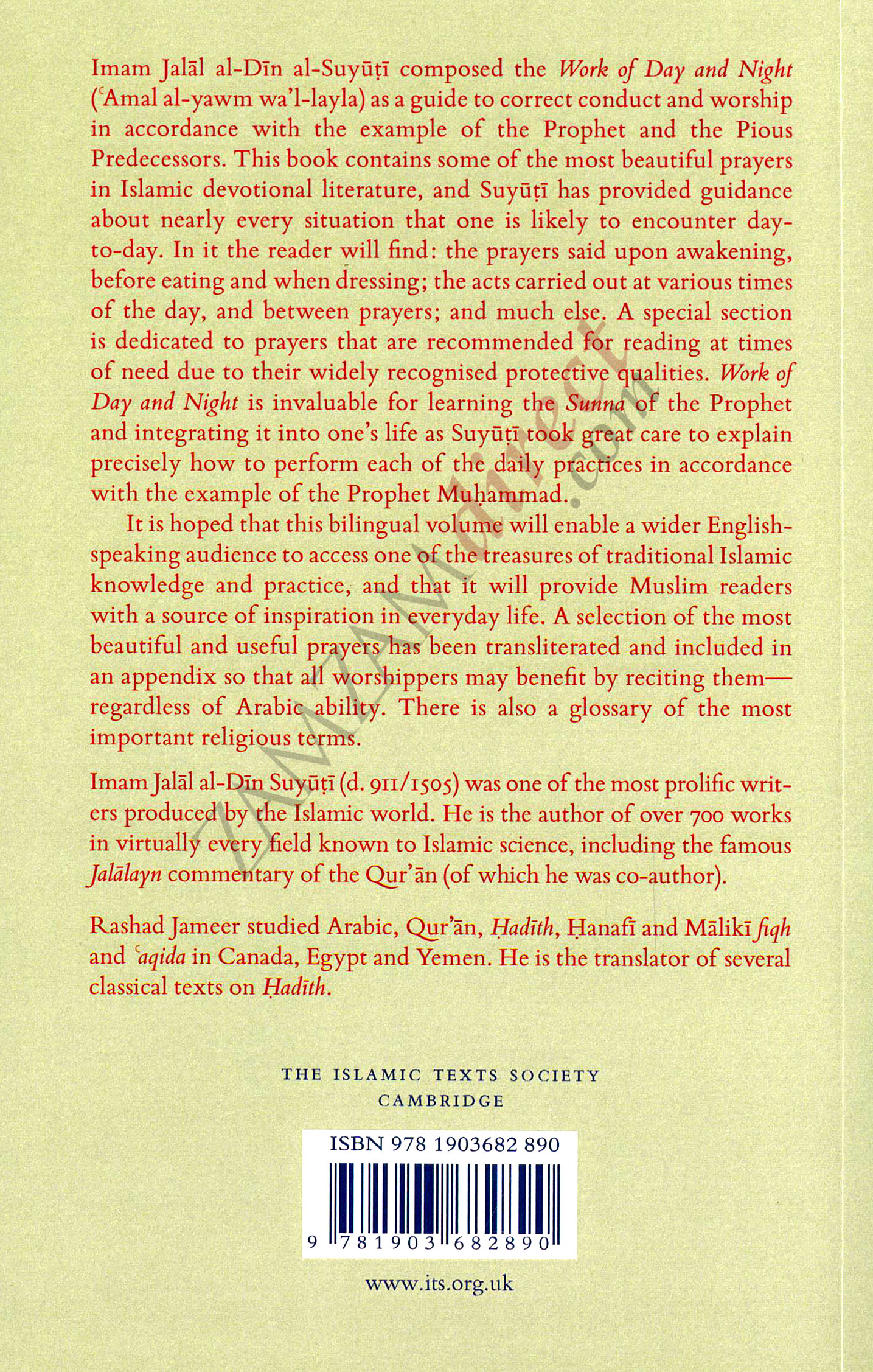Imam Jalal al-Din Suyuti (d. 911/1505) was one of the most prolific writers produced by the Islamic world. He is the author of over 700 works in virtually every field known to Islamic science, including the famous Jalalayn commentary of the Quran (of which he was co-author). His works are still widely used, and his name is a by-word for breadth of learning, voluminous output and a saintly life. The Work of Day and Night is Imam Suyutis collection of the daily and nightly practices of the Prophet of Islam and includes instructions on how to follow the Prophet in everyday actions and supplications. In it the reader will find: the prayers said upon awakening, before eating and when dressing; the acts carried out at various times of the day, and between prayers; the supplications recited in times of distress as well as of intimacy with God; and much else. This book is invaluable for learning the practices of the Prophet and integrating it into ones life.