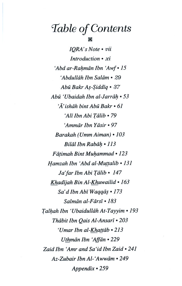 A more famous Haddith on this subject promises Paradise to ten Sahabah, popularly known as al-'Ashrah al-Mubasharin in Paradise. There are other traditions which mention the name of other Sahabah and Sahabiyat who were promised Paradise in their life time or soon after their death. We believe that all the Sahabah of the prophet Mohammad will enter Paradise; in this volume, we have included only those chosen ones who heard the good news from the Prophet himself.