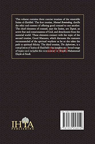 This volume contains three concise treatises of the venerable Imām al-Ḥaddād. The first treatise, Mutual Reminding, distils the ethic and content of offering good counsel to one another. The chief elements of counsel, says the Imām, are Taqwā, an active fear and consciousness of God, and detachment from the material world. These elements connect with the topic of the second treatise, Good Manners, which discusses the manners recommended of the spiritual wayfarer as he or she takes the path to spiritual felicity. The third treatise, The Aphorisms, is a compilation of Imām al-Ḥaddād’s wise insights on a broad range of topics and includes the commentary of Shaykh Muḥammad Ḥayāt al-Sindī.