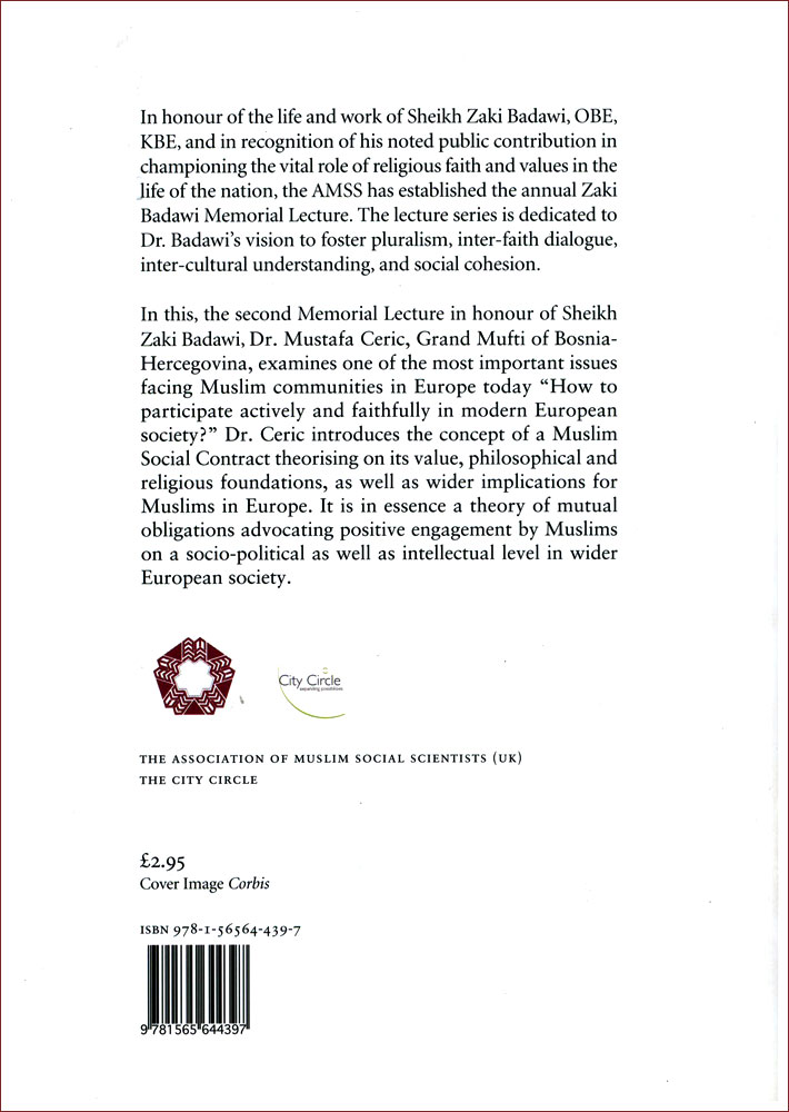 In honor of the life and work of Sheikh Zaki Badawi, OBE, KBE, and in recognition of his noted public contribution in championing the vital role of religious faith and values in the life of the nation, the AMSS has established the annual Zaki Badawi Memorial Lecture. The lecture series is dedicated to Dr Badawi's vision to foster pluralism, inter-faith dialogue, inter-cultural understanding, and social cohesion. In this, the second Memorial Lecture in honor of Sheikh Zaki Badawi, Dr. Mustafa Ceric, Grand Mufti of Bosnia-Hercegovina, examines one of the most important issues facing Muslim communities in Europe today ôHow to participate actively and faithfully in modern European society?ö Dr. Ceric introduces the concept of a Muslim Social Contract theorizing on its value, philosophical and religious foundations, as well as wider implications for Muslims in Europe. It is in essence a theory of mutual obligations advocating positive engagement by Muslims on a socio-political as well as intellectual level in wider European society. This is the second lecture in the Memorial Lecture series in honor of Sheikh Zaki Badawi.