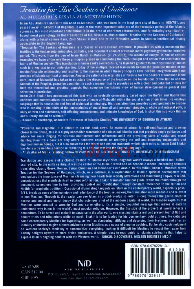 Imam Abu Abdullah al-Harityh bin Asad al-Muhasibi, who was born in the Iraqi port city of Basra in 165/781, and passed away in 243/857 at Baghdad, is one of the most important scholars of the formative period of the Islamic sciences. His most important contribution is in the area of character reformation, and formulating a spiritually-based moral psychology. In this translation of his, Risala al-Mustarshidin (Treatise for the Seekers of Guidance), along with a lucid commentary, Zaid Shakir makes one of the formative works in Muslim intellectual history accessible in the English language.