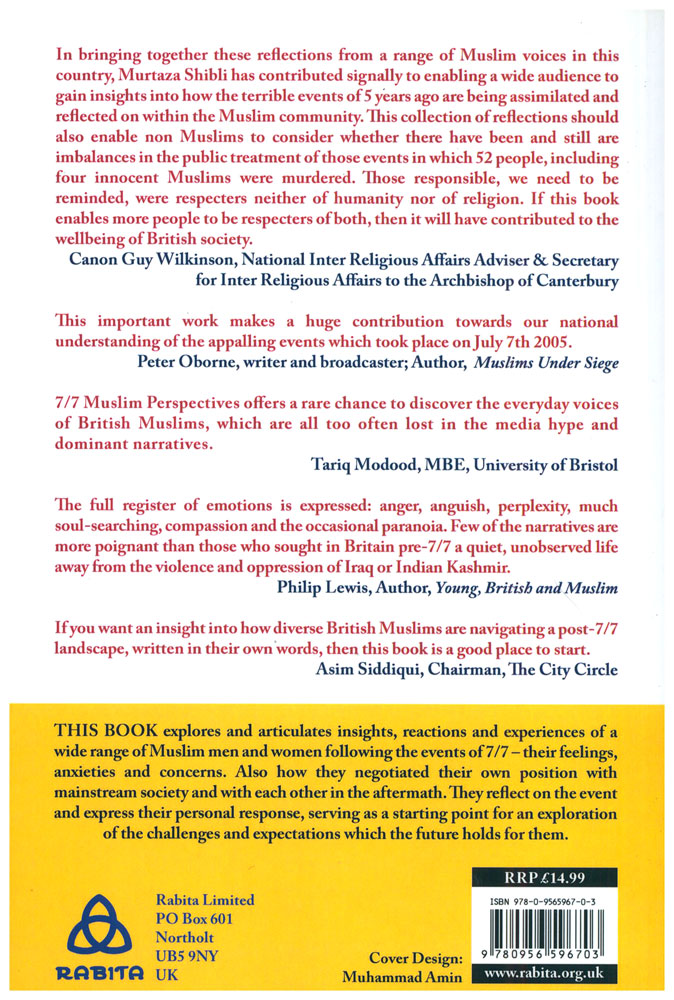 In bringing together these reflections from a range of Muslim voices in this country, Murtaza Shibli has contributed signally to enabling a wide audience to gain insights into how the terrible events of 5 years ago are being assimilated and reflected on within the Muslim community. This collection of reflections should also enable non Muslims to consider whether there have been and still are imbalances in the public treatment of those events in which 52 people, including four innocent Muslims were murdered. Those responsible, we need to be reminded, were respecters neither of humanity nor of religion. If this book enables more people to be respecters of both, then it will have contributed to the wellbeing of British society.
