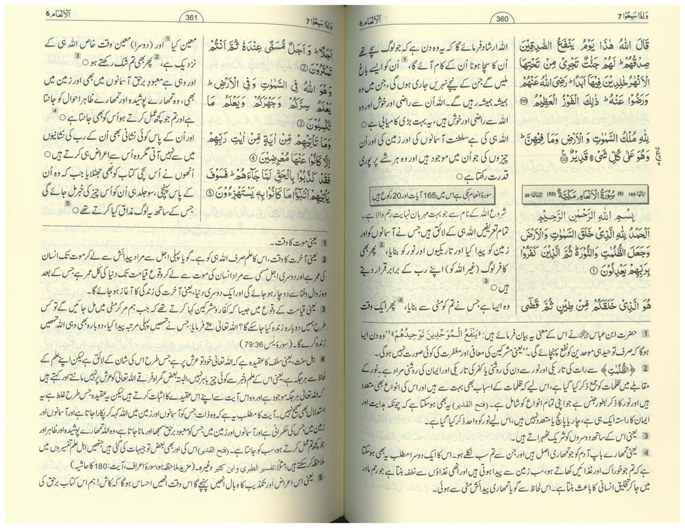 Tafseer Ahsan-ul-Bayan with Arabic Quran Text on right, Urdu translation on the left and tafsir on bottom as footnotes.