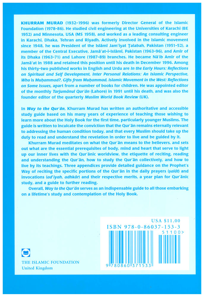 - In WAY TO THE QUR'AN, Khurram Murad sets out to share the fruits of his own journey with the ordinary, inexpert seekers after the Qur'an, especially the young men and women, who sincerely desire to read and understand it in order to fulfil their commitment to Allah, to His message and mission. The book has been born out of the conviction that the Qur'an, being the eternal Word of the Ever-living God, is as relevant for us, today, as it was 1400 years ago. Consequently, we almost have a right to receive its blessings, in some measure, as did its first believers, provided we fulfil the necessary guidelines. Each Muslim therefore has a duty to read and understand the Qur'an, and live by it. To explain the necessary guidelines is the purpose of this book.