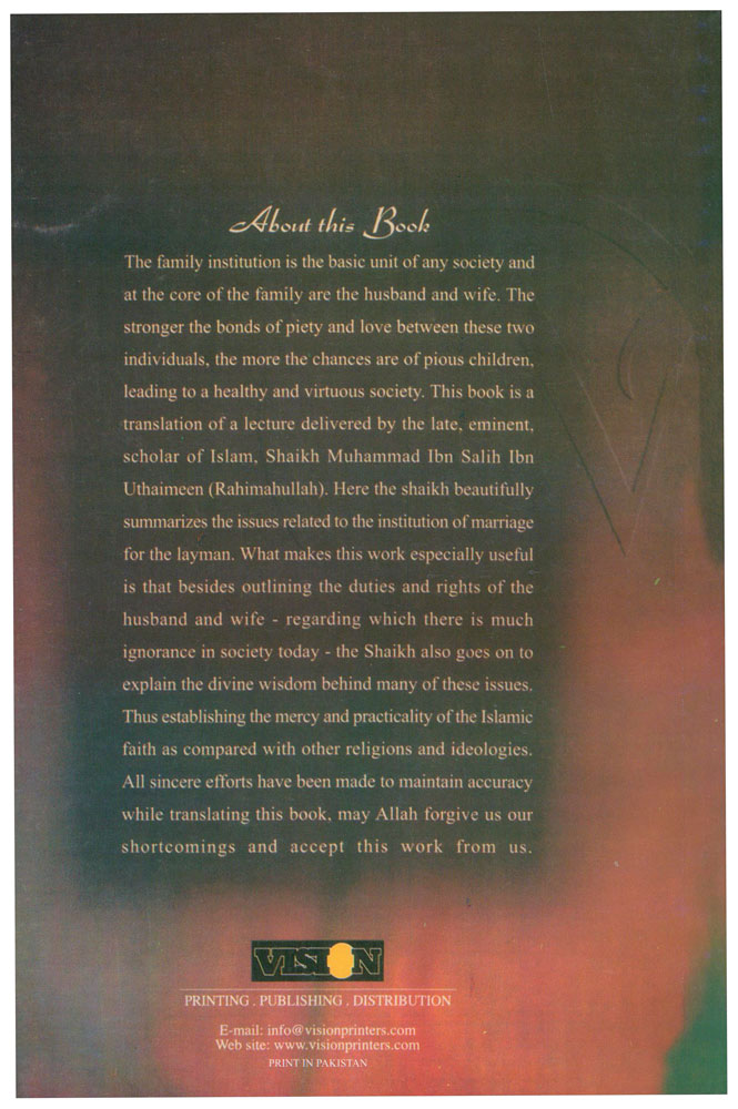 The family institution is the basic unit of any society and at the core of the family are the husband and wife. The stronger the bonds of piety and love between these two individuals, the more the chances are of pious children, leading to a healthy and virtuous society. this book is a translation of a lecture delivered by the late , eminent, scholar of Islam, Shaikh Muhammad Ibn Salih Ibn Uthaimeen ( Rahimahullah). Here the shaikh Beautifully summerizes the issues related to the institution of marriage for the layman. What makes this work especially useful is that besides outlining the duties and rights of the husband and wife - regarding which there is much ignorance in society today - the Shaikh also goes on to explain the divine wisdom behind many of these issues. Thus establishing the mercy and practicality of the Islamic faith as compared with other religions and idiologies. All sinsere efforts have been made to maintain accuracy while translating the book, may Allah forgive us our shortcomings and accept this work from us.