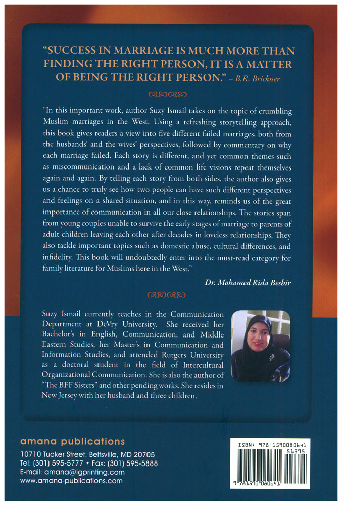 "In this important work, author Suzy Ismail takes on the topic of crumbling Muslim marriages in the West. Using a refreshing storytelling approach, this book gives readers a view into five different failed marriages, both from the husbands' and the wives' perspectives, followed by commentary on why each marriage failed. Each story is different, and yet common themes such as miscommunication and a lack of common life visions repeat themselves again and again. By telling each story from both sides, the author also gives us a chance to truly see how two people can have such different perspectives and feelings on a shared situation, and in this way, reminds us of the great importance of communication in all our close relationships. The stories span from young couples unable to survive the early stages of marriage to parents of adult children leaving each other after decades in loveless relationships. They also tackle important topics such as domestic abuse, cultural differences, and infidelity. This book will undoubtedly enter into the must-read category for family literature for Muslims here in the West." -