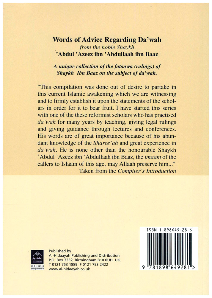 Author: Abdul Azeez ibn Abdullaah ibn Baaz Translator: Bint Feroz Deen & Bint Abd al-Ghafoor Publisher: Al-Hidaayah Publishing & Distribution Size/Vol.: A5 (14.8x21 cm - 5.83x8.27 in) ISBN : 1898649286 Language : English -Binding: Paperback -