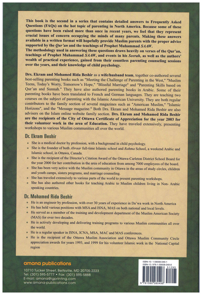 This book provides the reader with answers to the most frequently asked questions on the subject of parenting in North America from an Islamic perspective. The answers cover a variety of topics such as correcting behavior, schooling, environment, celebrations, sex education, and others.