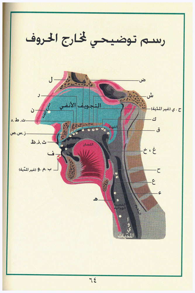 The dark blue color indicates the emphatic of the letter (R), the blue color indicates the unrest letters-echoing sound- (qualquala)