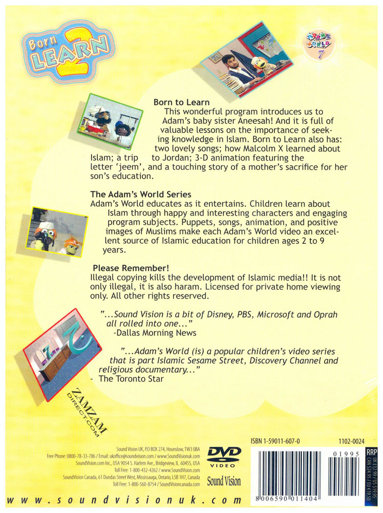- In Adam's World 7, a beautiful song, a segment on how hearing impaired Muslims learn Islam and more emphasize to Adam that Muslims must be learners for life. Knowledge seeking also comes into play in the animated presentation on the Arabic letter "jeem" and an illustrated story of a mother's quest to make her son a great Islamic scholar.