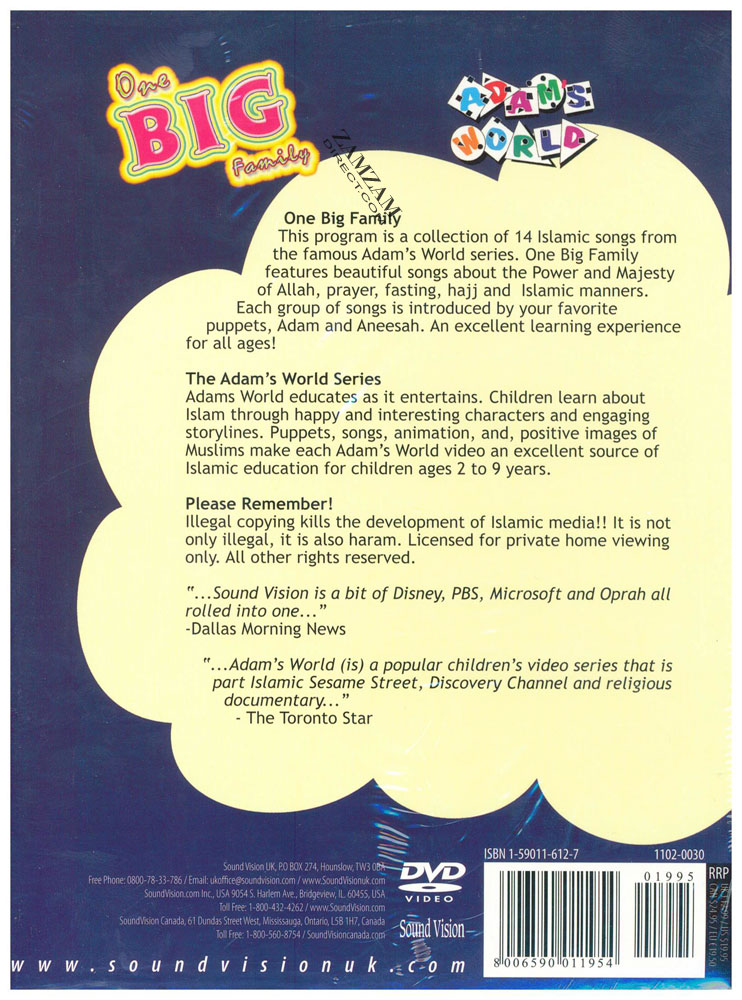 One Big Family features 14 beautiful songs about the power and majesty of Allah, prayer, fasting, Hajj and other Islamic etiquettes. Adam and Aneesah introduce each group of songs. One Big Family is an excellent addition to your family's video library.