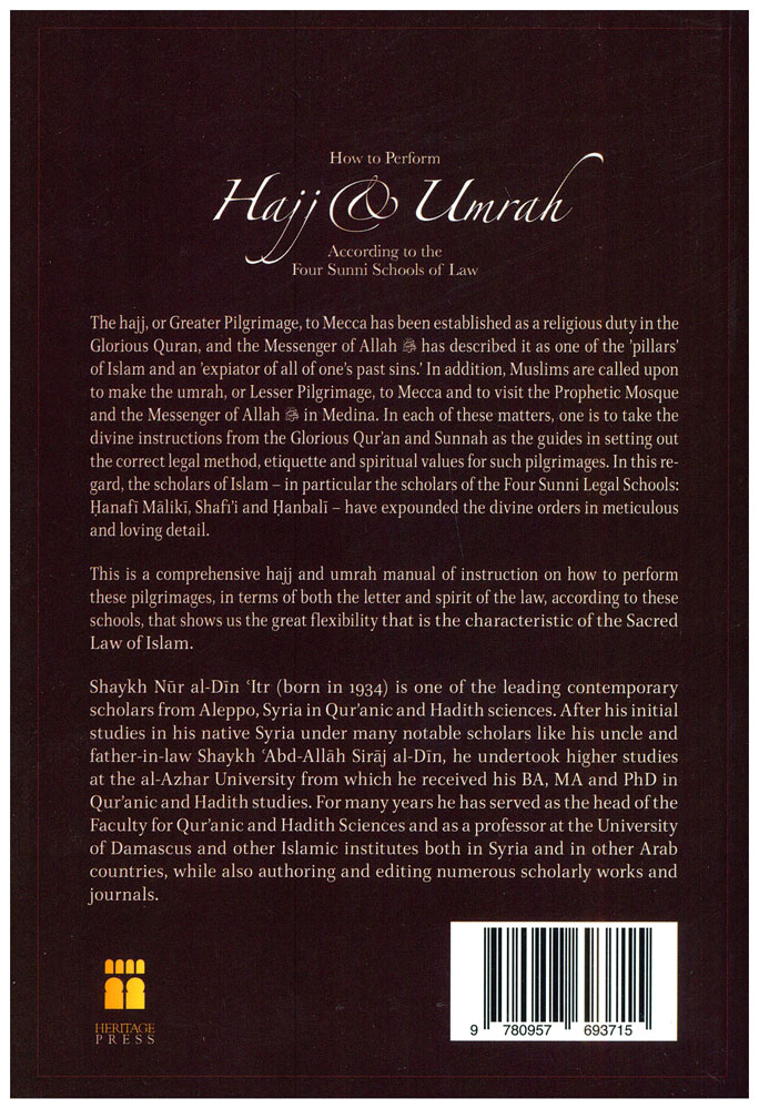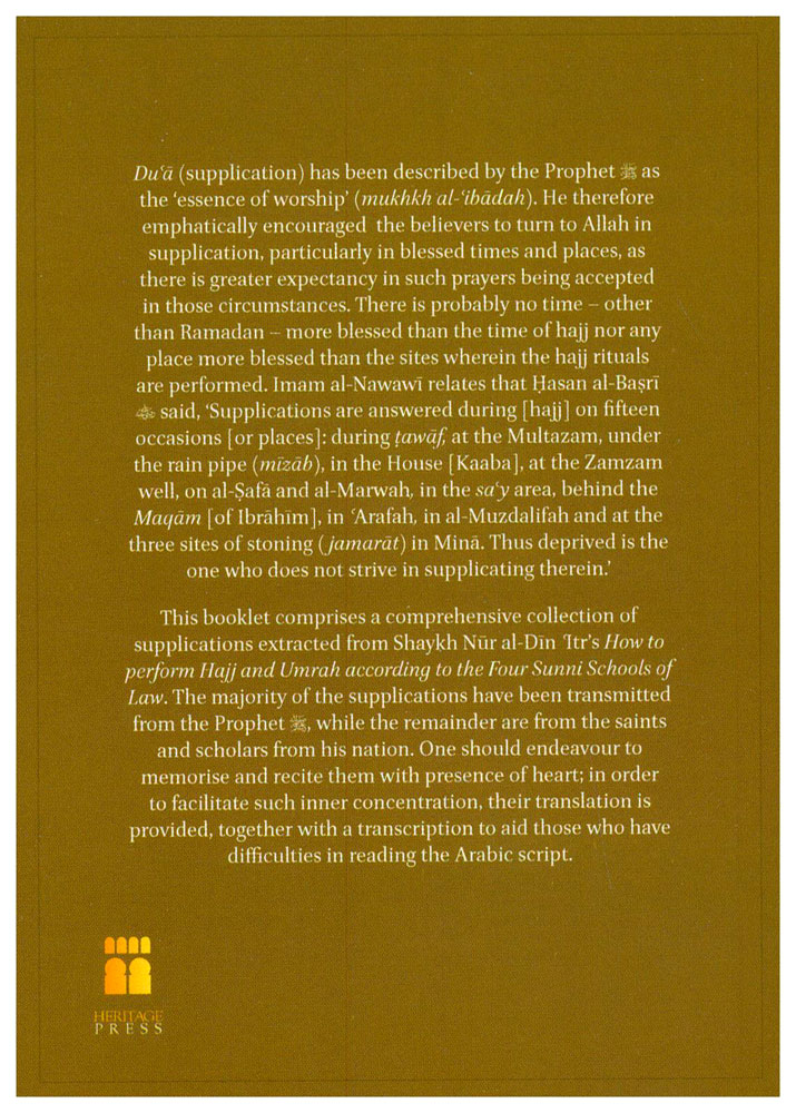 This booklet comprises a comprehensive collection of supplications extracted from Shaykh Nur al-Din 'Itr�s How to perform Hajj and Umrah according to the Four Sunni Schools of Law. The majority of the supplications have been transmitted from the Prophet (SAW), while the remainder are from the saints and scholars from his nation.