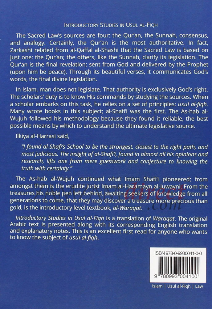 Author: Mahmud Adam Publisher: The Imam shafi'i Bookstore Paperback ISBN : 9780993004100 Language : English -Imam al-Haramayn's Waraqat is one of the most famous primers in the subject of usul al-fiqh. Rarely does a student study this subject without studying this text. Its compact size and lucid passages make it an excellent read to gain a solid understanding of the most crucial discourses in this most important science. This book contains the full Arabic original features along with its corresponding English translation and English translation features along with explanatory notes that elucidate the text in detail. This work was compiled to serve as an introductory level reader into the subject of usul al-fiqh. The work is set in Linotype's Corona, with the Arabic featuring in Lotus and printed on premium cream FSC certified paper.