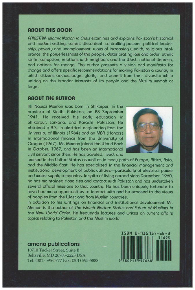 ALI NAWAZ MEMON was born in Shikarpur, in the province of Sindh, Pakistan, on 28 September 1941. He received his early education in Shikarpur, Laerkana, and Karachi, Pakistan. He obtained a B.S. in electrical engineering from the University of Illinois (1964) and an MBA (Honors) in international finance from the University of Oregon (1967). Mr. Memon joined the World Bank in October 1967, and has been an international civil servant since then. He has traveled, lived and worked in the United States as well as in many parts of Europe, Africa, Asia, and the Middle East. He has specialized in the financial management and institutional development of public utilities – particularly of electrical power and water supply companies. In spite of living abroad since December 1960, he has maintained close ties and contact with Pakistan and has undertaken several official missions to that country. He has been uniquely fortunate to have had many opportunities to interact with and be exposed to the views of peoples from the West and from Muslim countries.